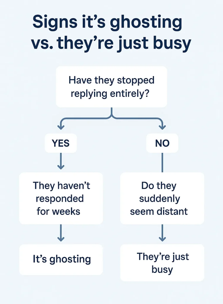 Look for consistency. If days pass without replies, excuses become vague, or they’re active on social media but ignoring you, it’s a strong sign of ghosting.
