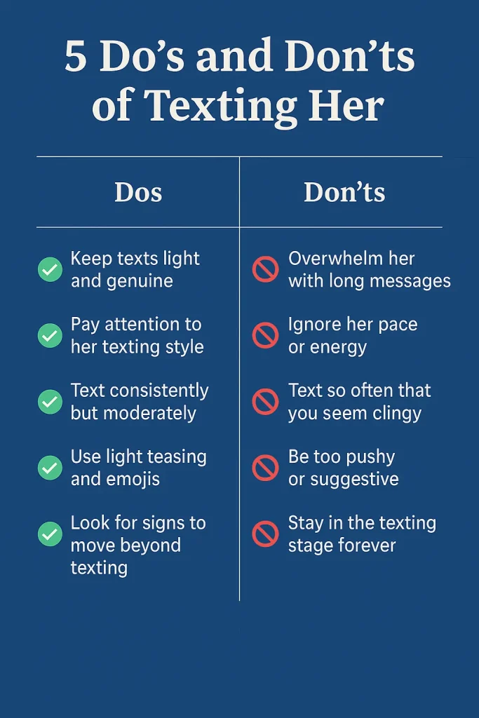 In simple terms: be yourself, keep it clear, and match her energy. If she’s playful, join in. If she’s thoughtful, respond with care. The goal isn’t to impress with fancy words—it’s to connect and make her feel comfortable texting back.