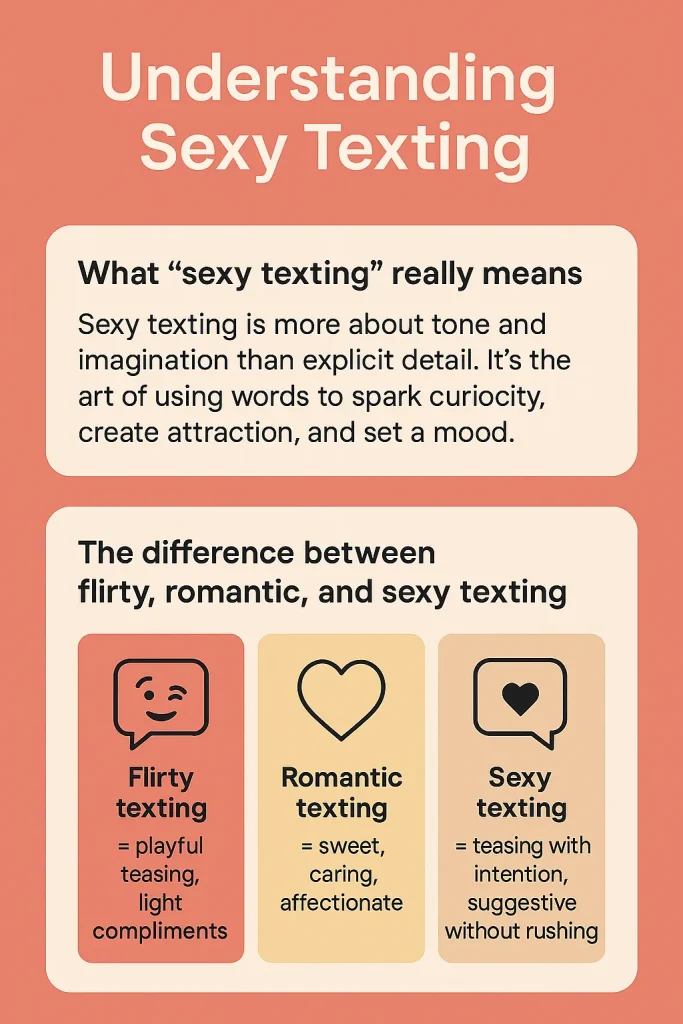 - Sexy texting = teasing with intention, suggestive without rushing into explicitness.