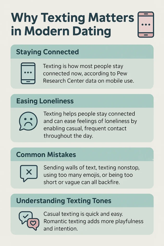 - Texting is a bridge, not the destination. The goal is to build enough comfort and interest to connect in real life.